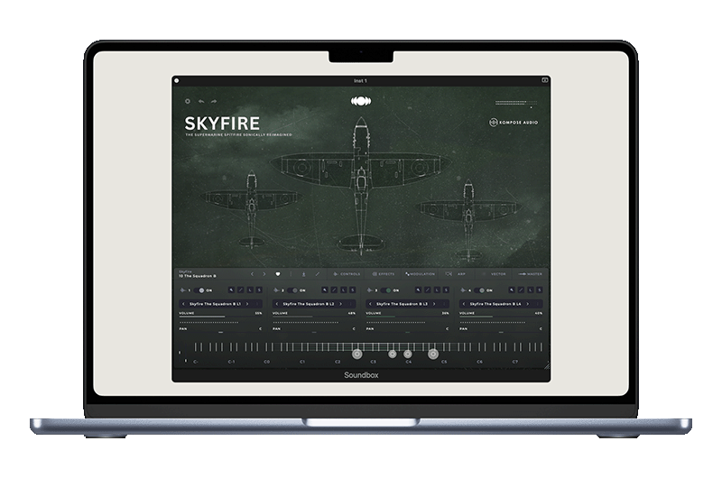 Inside Skyfire, you’ll find three core layers. The first two were originally created from the raw recordings of the Supermarine Spitfires - looped fragments of engine tone that were shaped and processed in Kontakt using tools such as the Tone Machine and Wavetable engines. These layers were then faithfully duplicated and adapted for Soundbox. The third layer is derived from our analog synths, including the Arturia PolyBrute, MiniBrute, and Behringer Poly-D, adding depth and cinematic warmth to the instrument.
