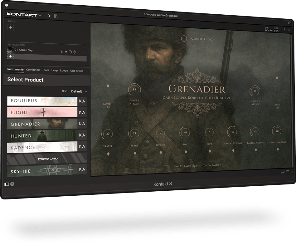 Grenadier é um novo e poderoso instrumento para Kontakt, criado para compositores e sound designers atraídos pelos lados mais sombrios do som cinematográfico. Com 10 presets cuidadosamente elaborados, ele oferece uma paleta de texturas ásperas, atmosferas assombrosas, tons graves profundos e leads gelados e fragmentados.